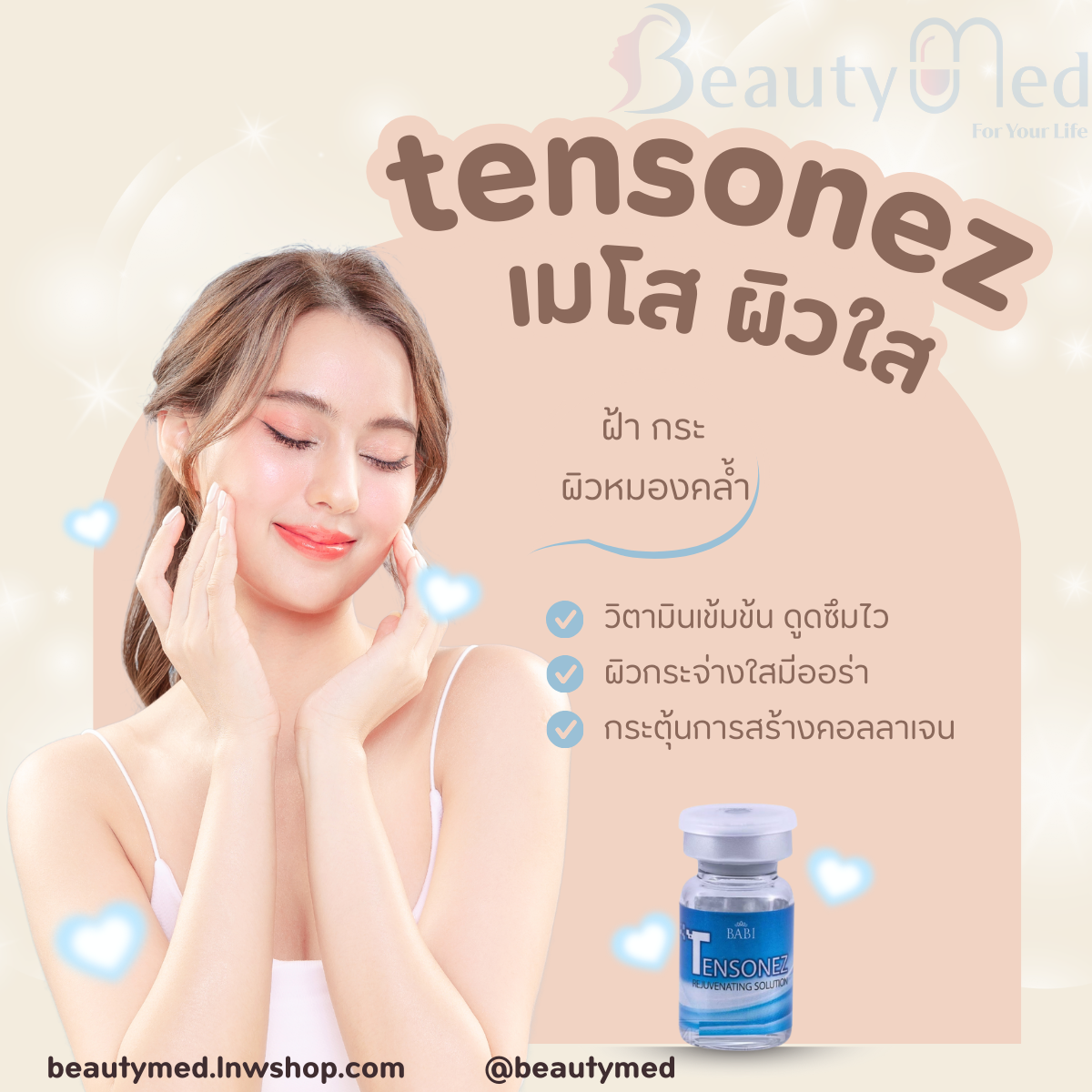 Tensonez คือหนึ่งในยี่ห้อเมโสหน้าใสจากประเทศเกาหลีที่ได้รับความนิยม เหมาะสำหรับผู้ที่มีปัญหาฝ้า กระ หลังฉีดจะช่วยให้กระจ่างใสขึ้น ปรับผิวที่ไม่สม่ำเสมอให้ดูเรียบเนียนสดใส ฟื้นฟูสภาพผิวให้แข็งแรงขึ้น