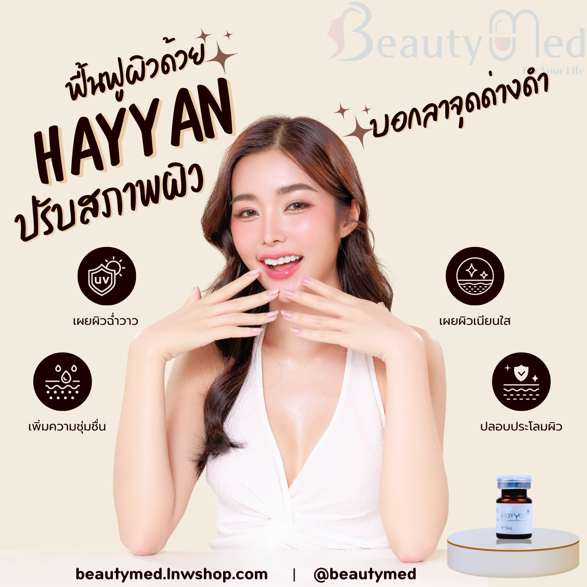 Hayyan คือ ผลิตภัณฑ์นำเข้าจากประเทศเกาหลี ซึ่งเป็นนวัตกรรมรวมอาหารผิวที่จะช่วยปรับสภาพผิว ลดเลือนริ้วรอย ลดรอยแดงรอยดำ กระตุ้นการสร้างคอลลาเจน ปรับสีผิวให้สว่างและดูสม่ำเสมอมากขึ้น โดยมีส่วนประกอบหลัก คือ Glutathione, PDRN, Vitamin B3, Vitamin C, Hyaluronic Acid (HA) และมีวิตามินบำรุงผิวและแร่ธาตุมากถึง 57 ชนิด ที่จะทำหน้าที่ในการต้านสารอนุมูลอิสระ ฟื้นฟูสภาพผิว ช่วยให้ผิวพรรณกระจ่างใส ลดเลือนฝ้ากระได้ดีมาก ๆ รวมถึงช่วยเรื่องรอยสิวและจุดด่างดำต่าง ๆ ที่หมองคล้ำให้จางลง