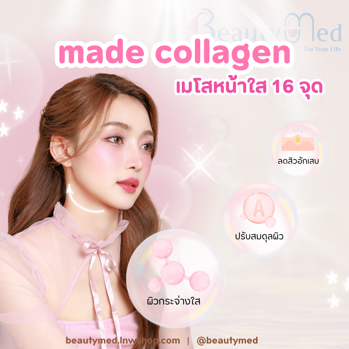 Made Collagen is another clear face meso that has an injection technique that seems different from other clear face meso brands. Made uses a technique of injecting medicine using acupuncture at 16 points along with the principle of Lymphatic Drainage, which is a technique developed in Italy. This technique is a clear face meso injection that is less painful than general injections and also causes less swelling and bruising. Injecting at 16 points of Made is an injection to distribute medicine through the circulatory system and lymphatic system. This technique is very popular both in Thailand and abroad.