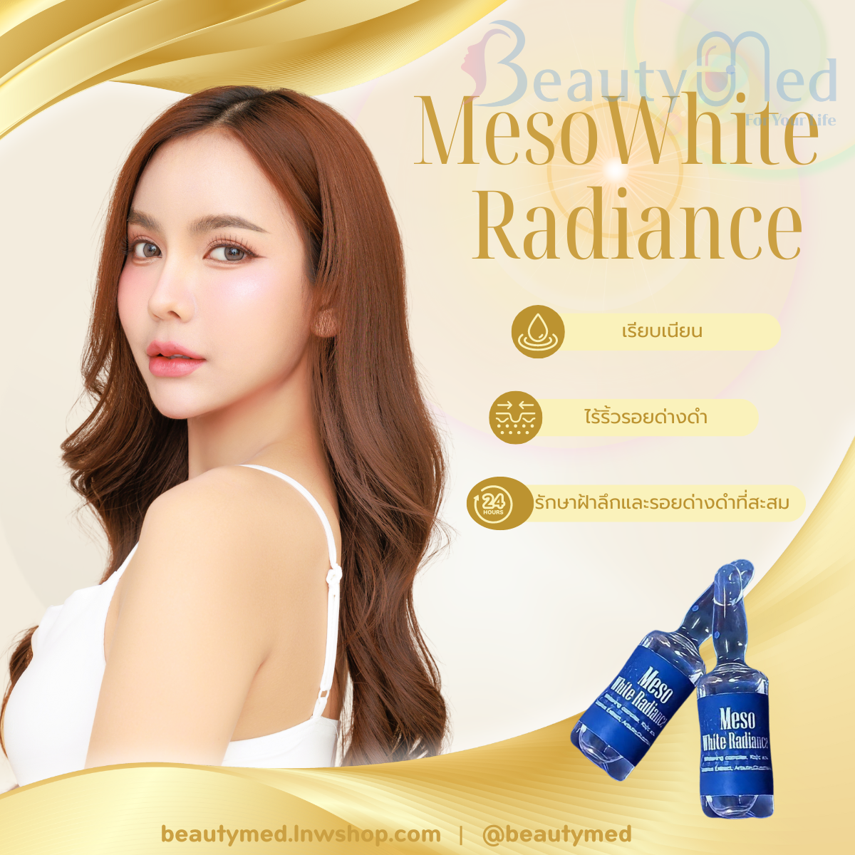Meso White radiance คือ ประกอบด้วยสารสกัดจากธรรมชาติและวิตามินหลากหลายชนิดที่ช่วยยับยั้งการสร้างเม็ดสีผิว อีกทั้งป้องกันความหมอง คล้ำที่ถูกกระตุ้นจากแสงแดด มีสารต้านอนุมูลอิสระที่เป็นสาเหตุแห่งริ้วรอยบนใบหน้า เมโสตัวนี้มีความโดดเด่นเรื่องการรักษาฝ้าลึกและรอยด่างดำที่สะสมมานานบนใบหน้าMeso White Radiance เหมาะสำหรับใครบ้าง